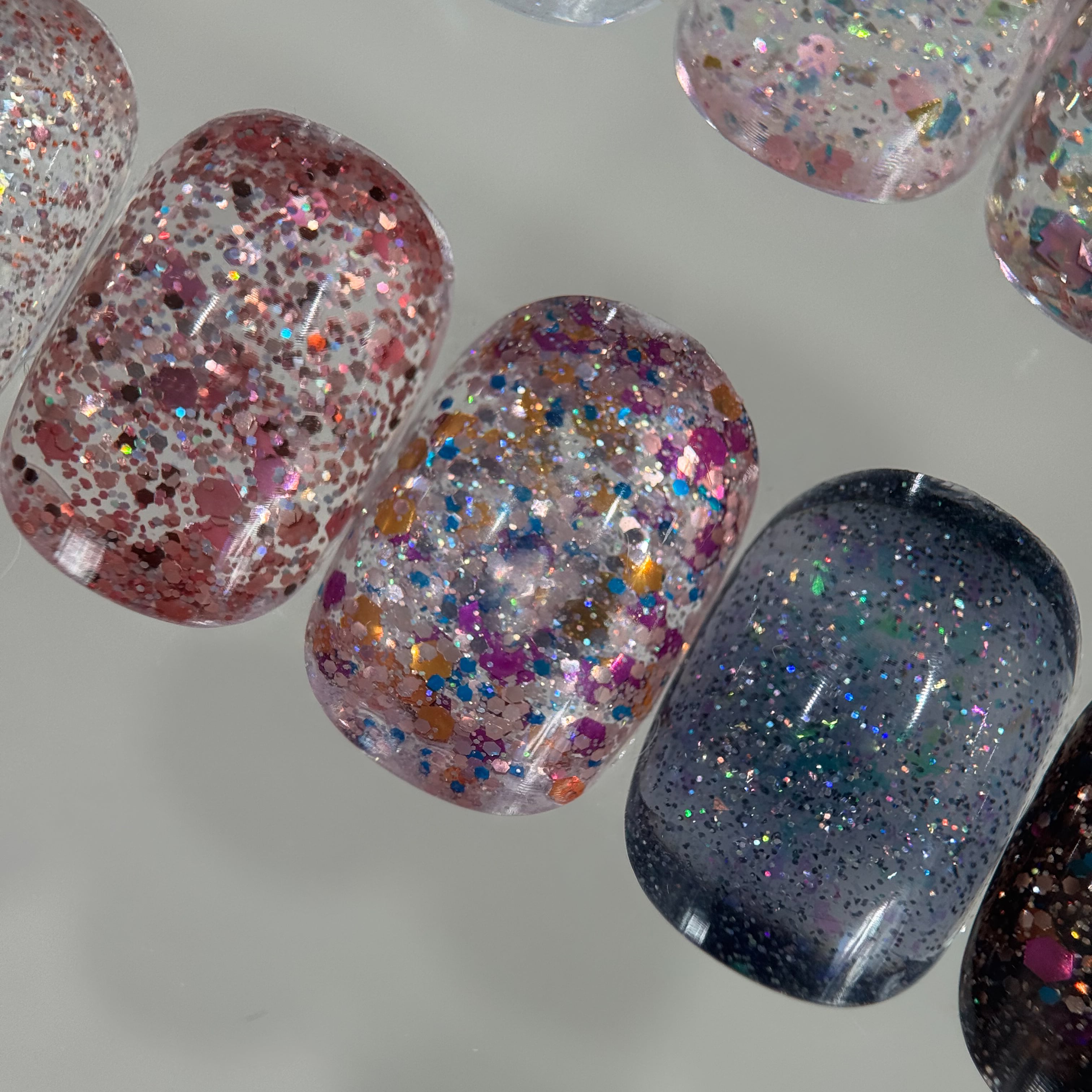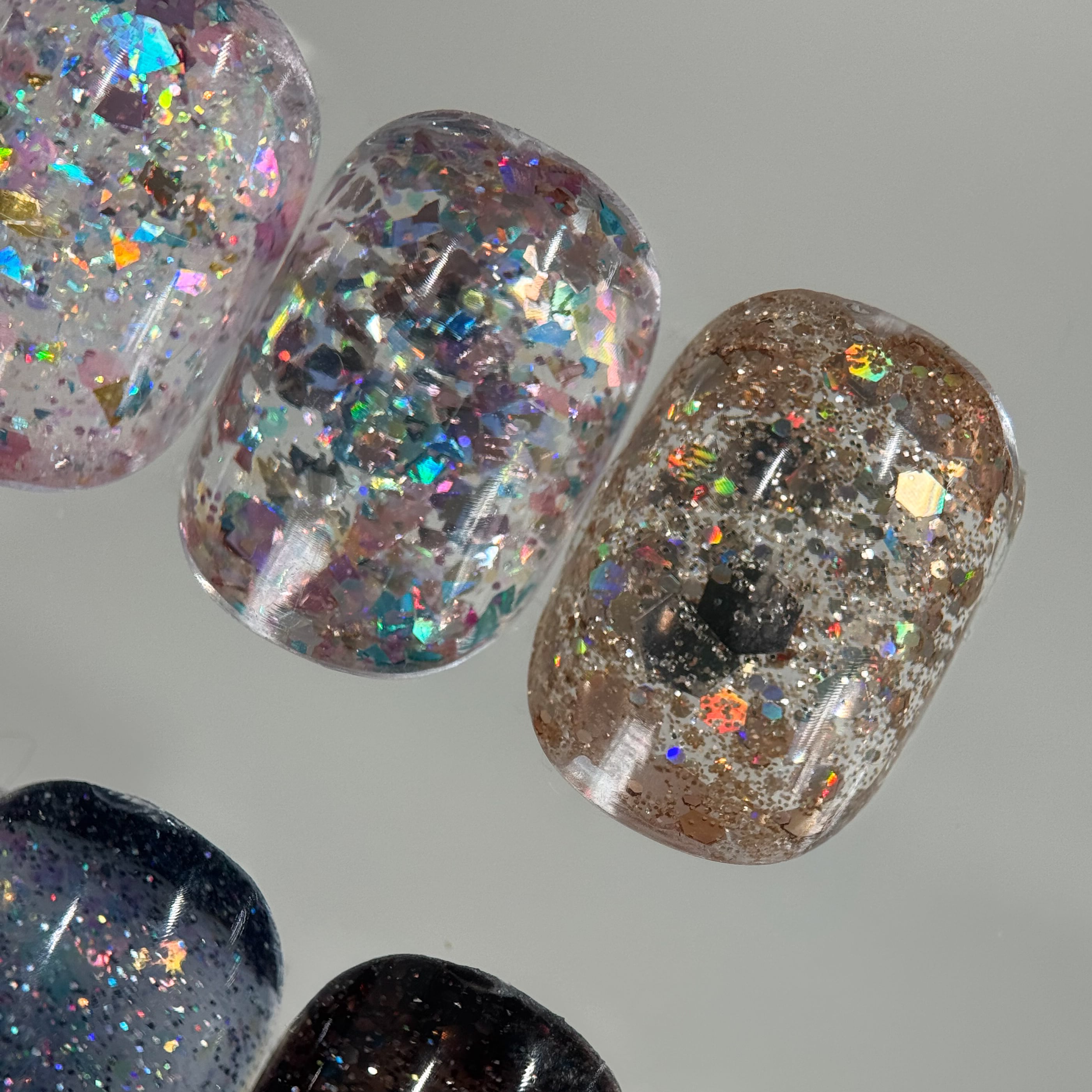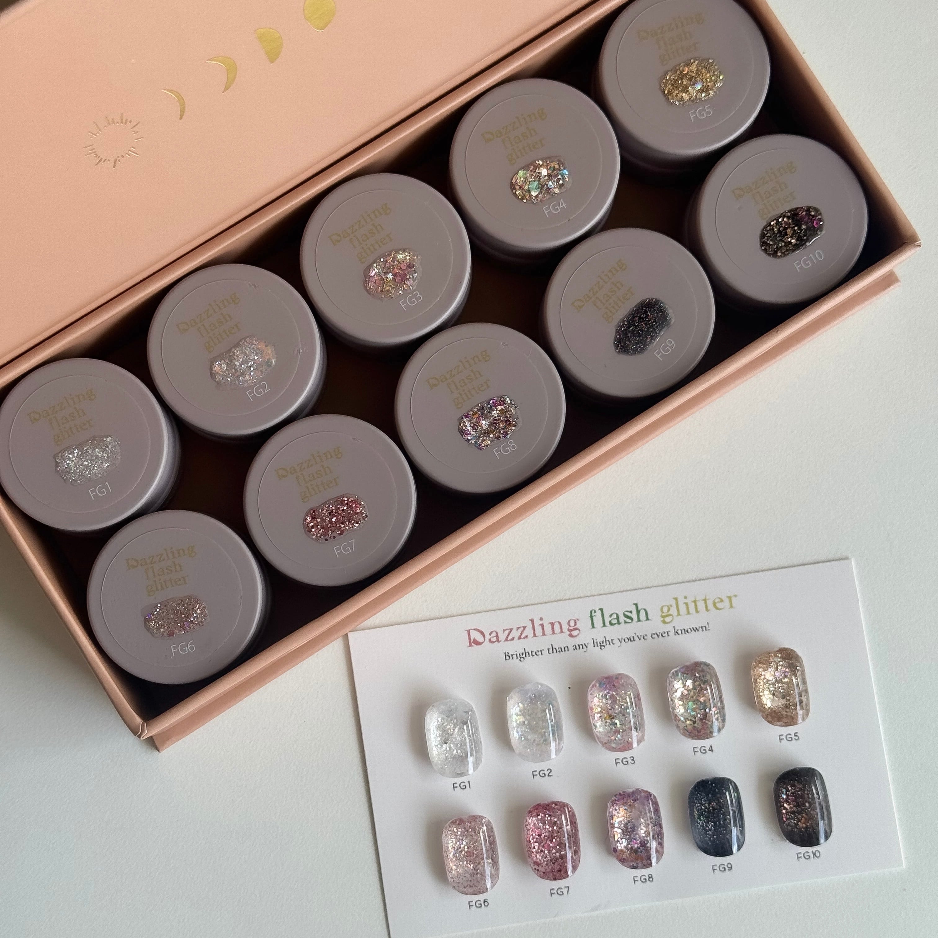 カラーによって入っているグリッター、ホロ、フレーク、フィルムのカラーやサイズは全て違い、控えめからギラギラまで10種類のフラッシュグリッターを揃えました♡